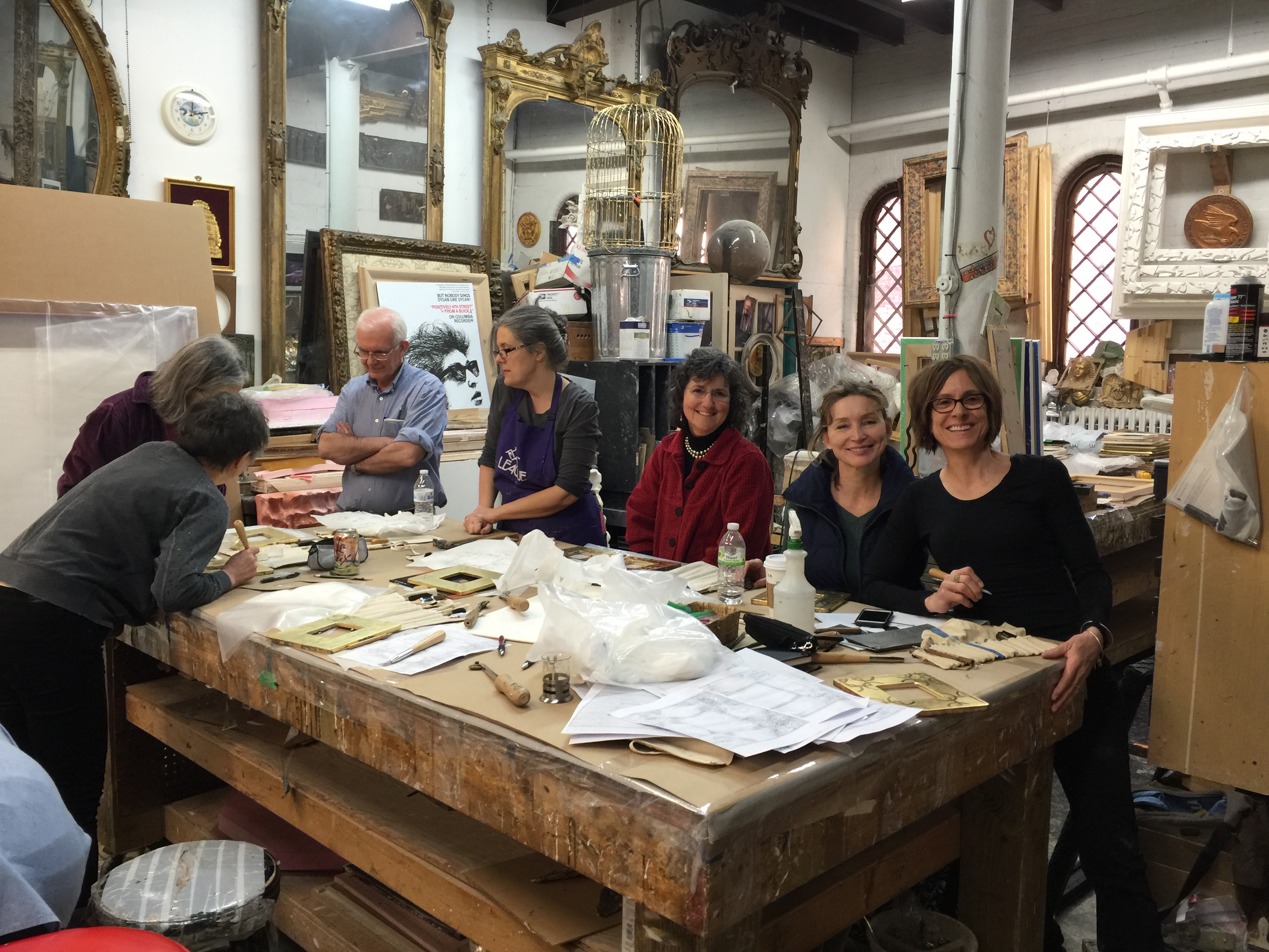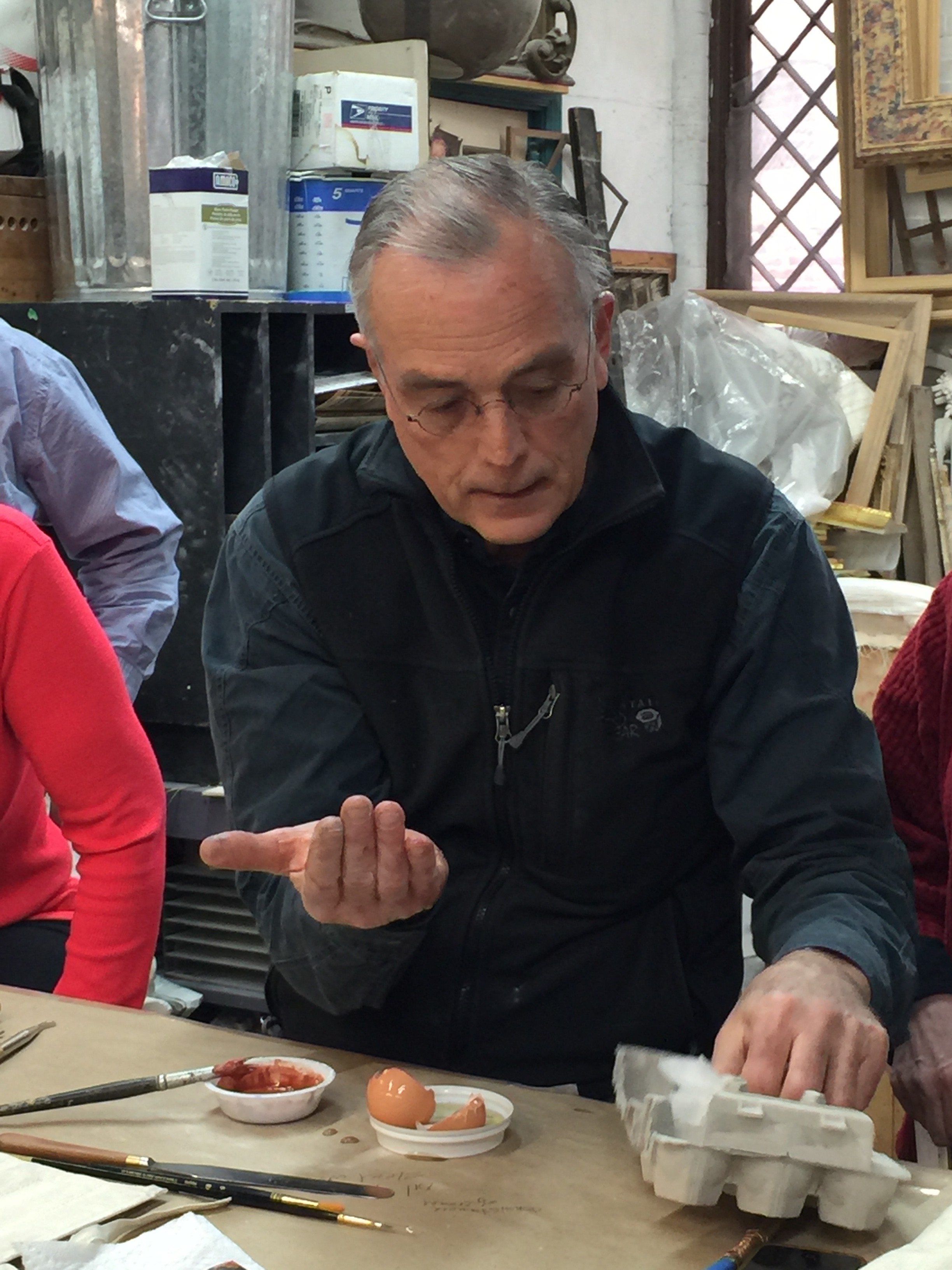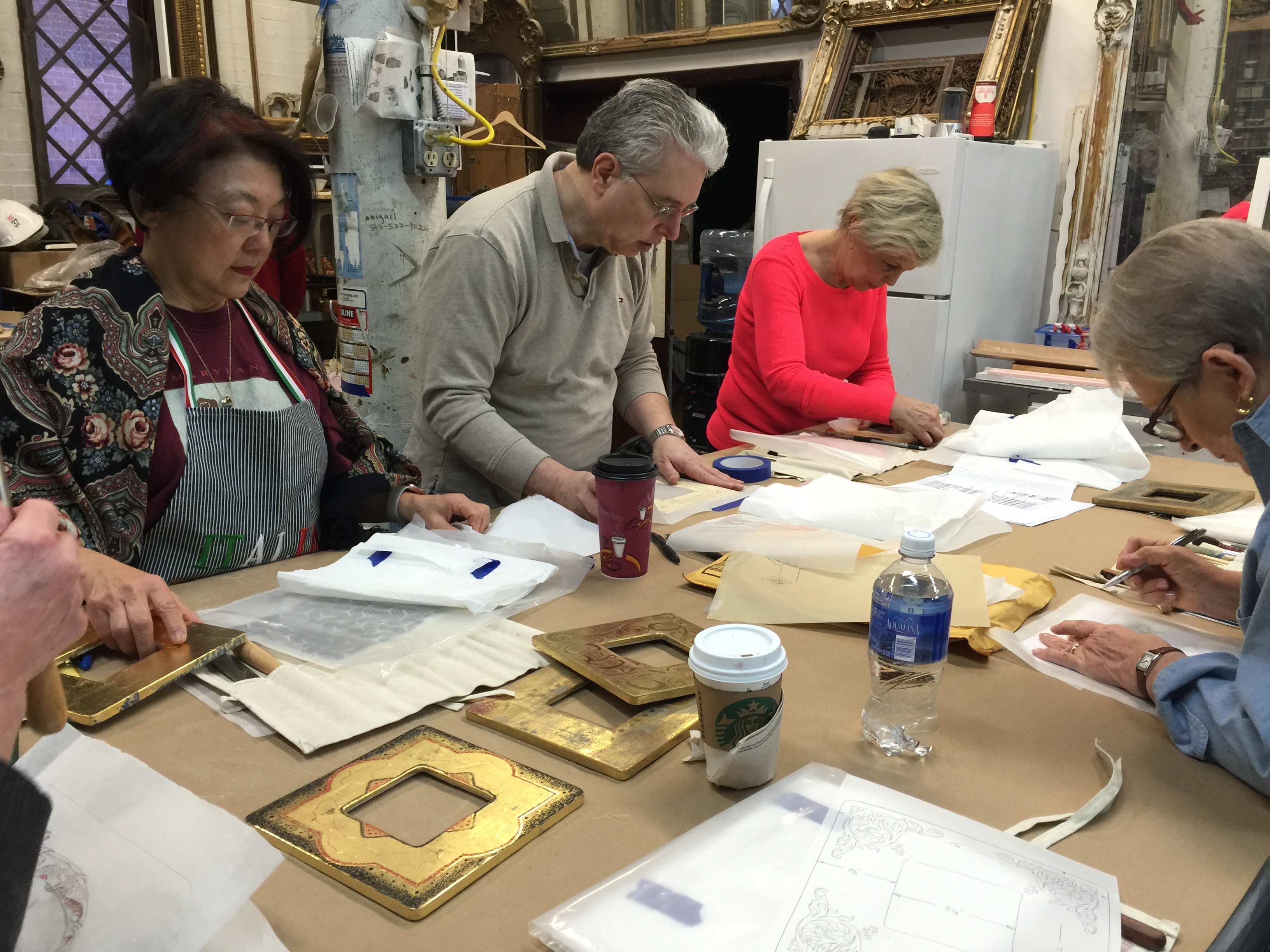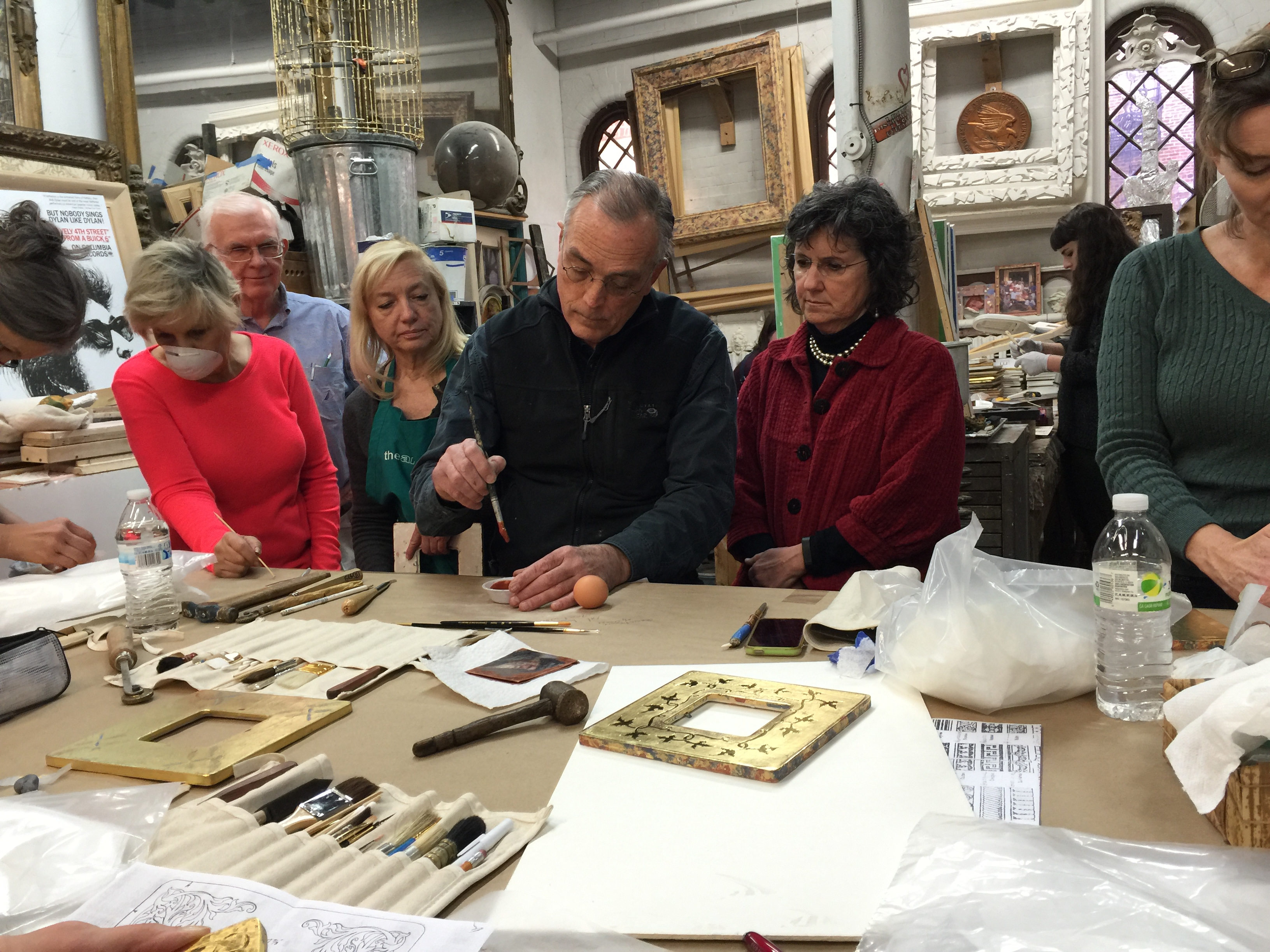 Bill and his staff were friendly, knowledgeable and encouraging as our group of eighteen artists asked them at least a thousand questions while we practiced gilding our own projects. The process of achieving a beautifully gilded piece, an art object in and of itself, requires many steps and a lot of patience. Bill’s staff demonstrated the delicate art of laying down the gold leaf, and then transferring and burnishing designs onto the gilded surface. After painstakingly applying the design, we rubbed away some of the areas with the finest steel wool and pumice to reveal hints of the surface below, and then painted other areas with egg tempera. There were several additional steps that included applying shellac, sepia-tinted casein, wax and alcohol for a truly antique finish. This is greatly oversimplified, but you get the idea.