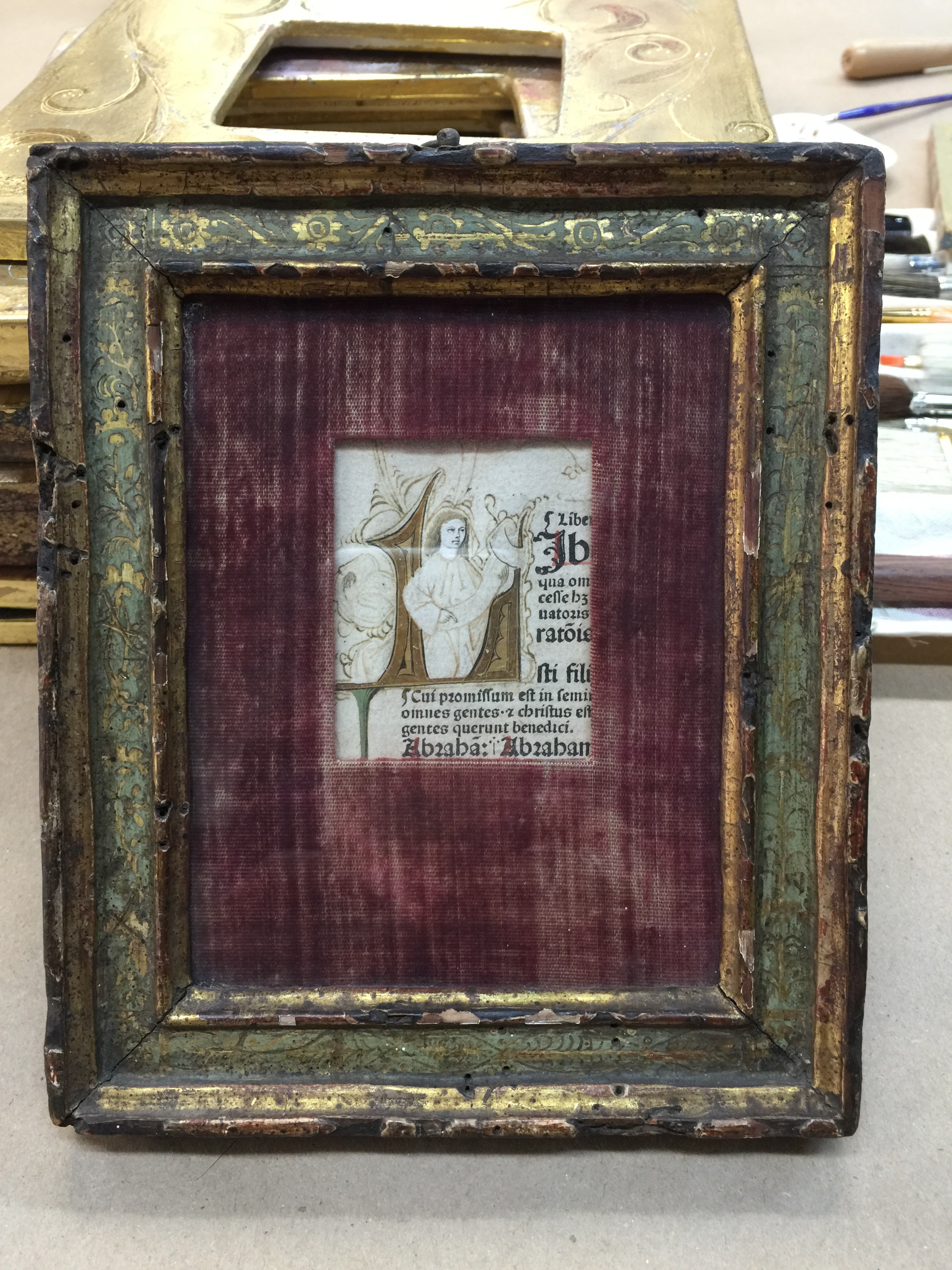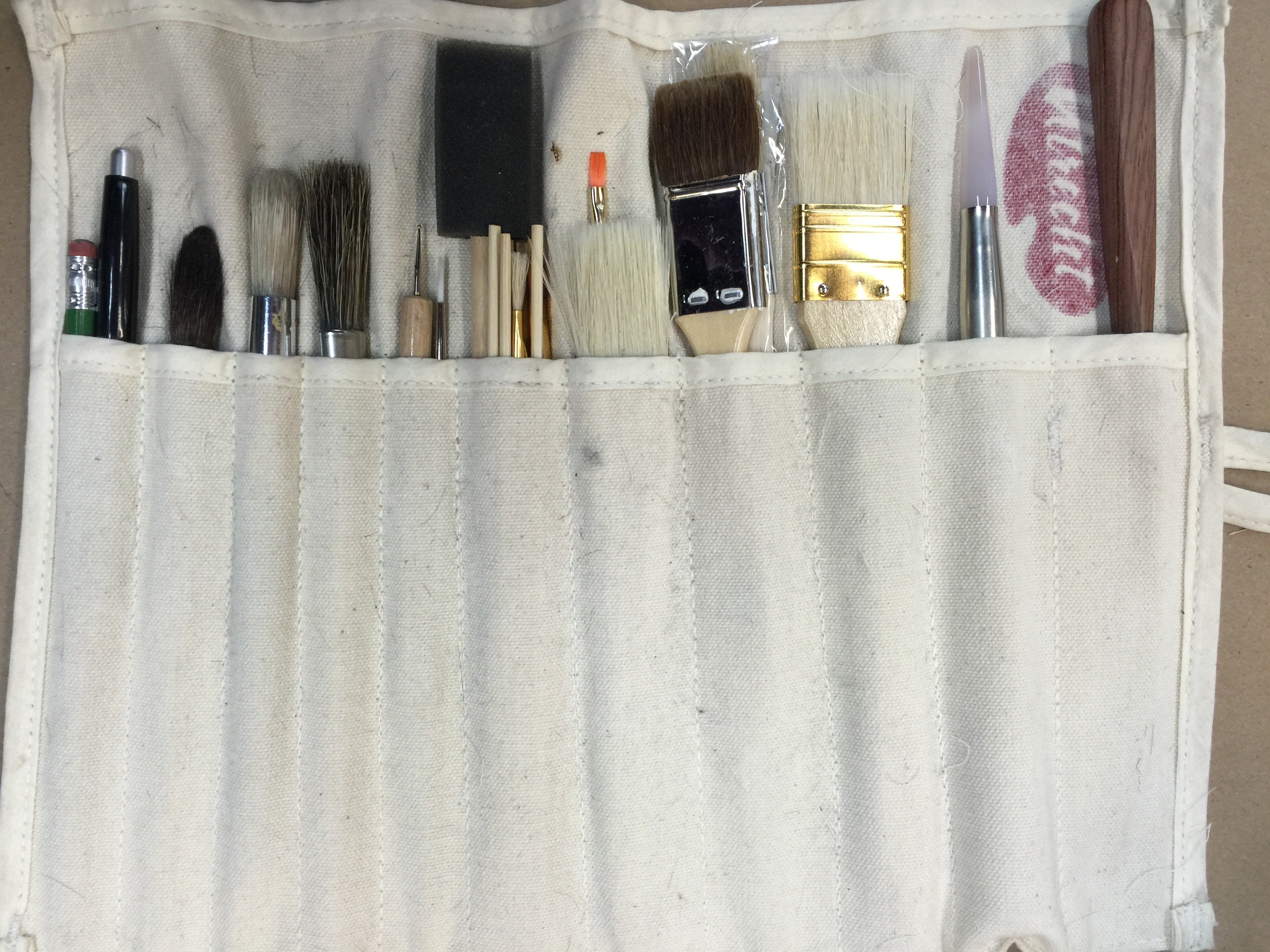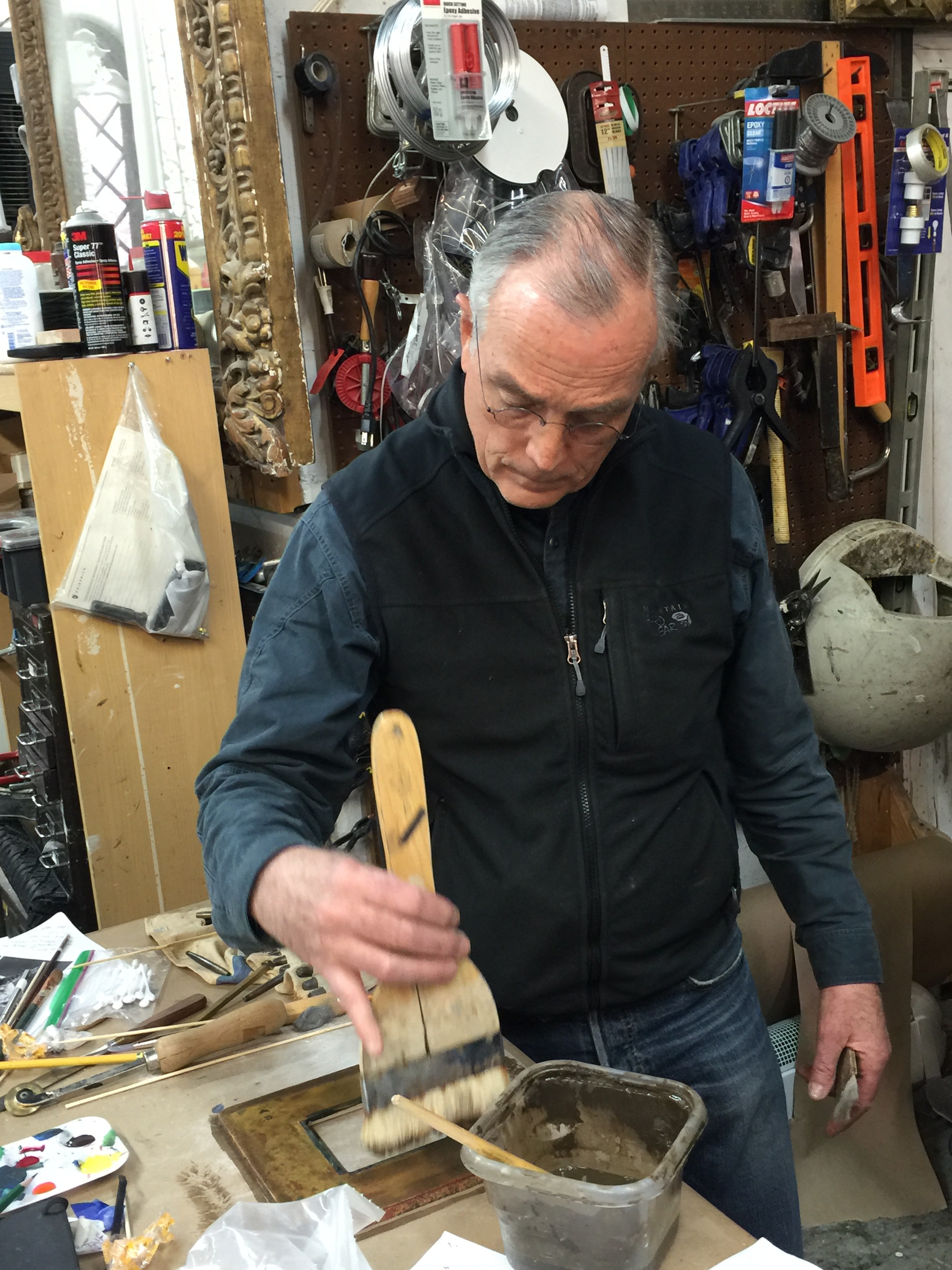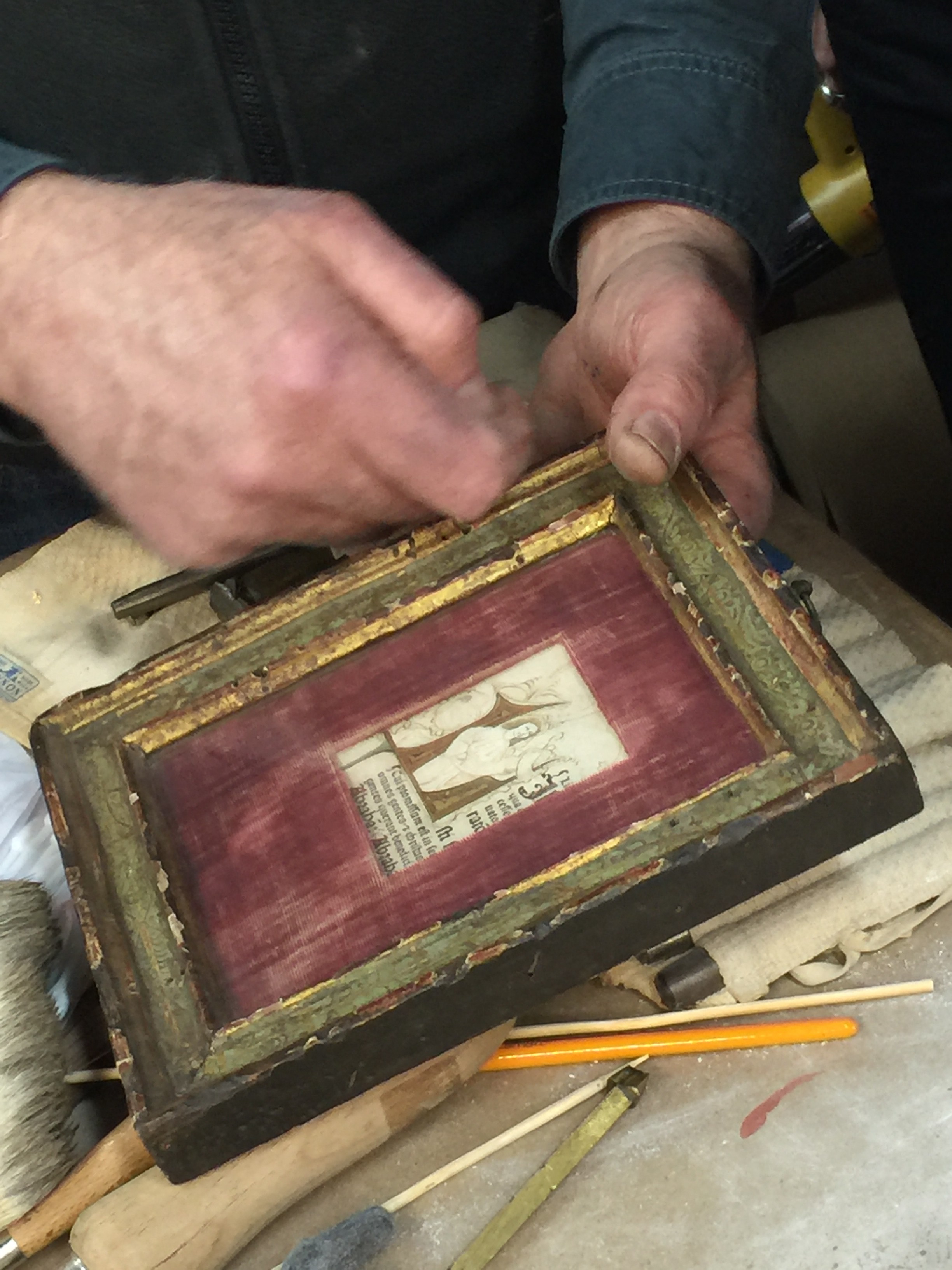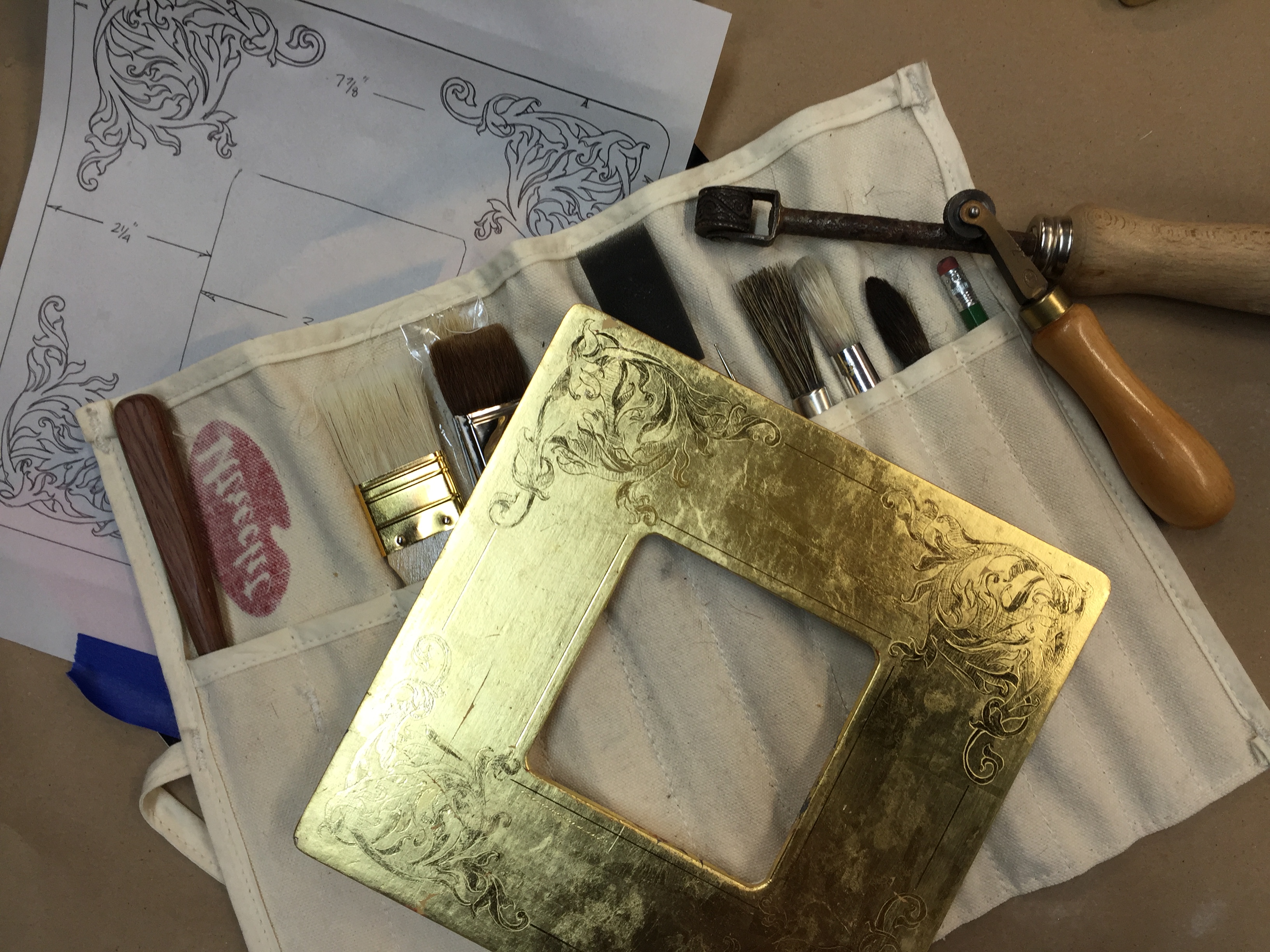 Bill and his staff were friendly, knowledgeable and encouraging as our group of eighteen artists asked them at least a thousand questions while we practiced gilding our own projects. The process of achieving a beautifully gilded piece, an art object in and of itself, requires many steps and a lot of patience. Bill’s staff demonstrated the delicate art of laying down the gold leaf, and then transferring and burnishing designs onto the gilded surface. After painstakingly applying the design, we rubbed away some of the areas with the finest steel wool and pumice to reveal hints of the surface below, and then painted other areas with egg tempera. There were several additional steps that included applying shellac, sepia-tinted casein, wax and alcohol for a truly antique finish. This is greatly oversimplified, but you get the idea.