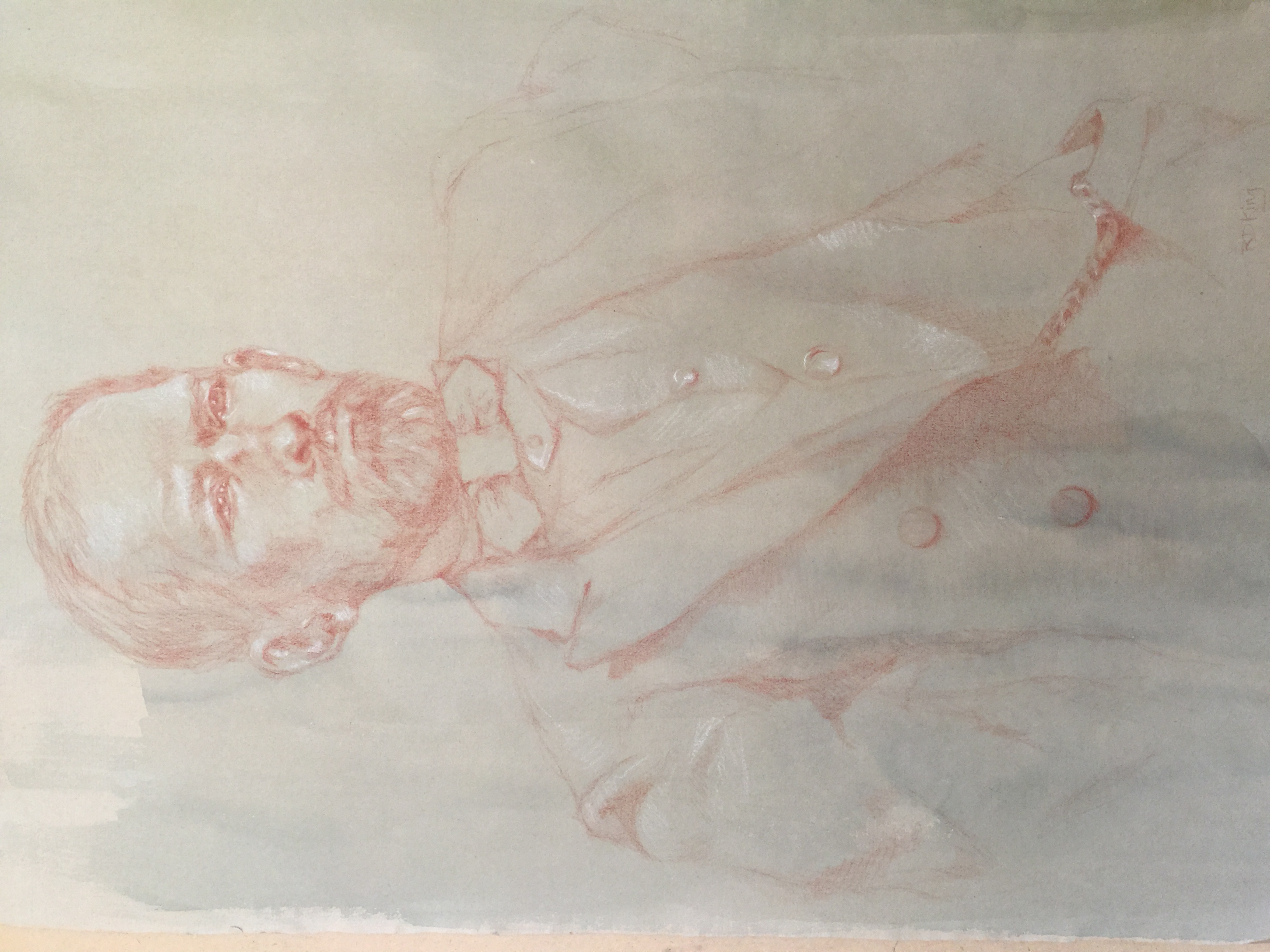Maybe that’s why his character shone through our fabulous model and inspired me to render him as genuinely as possible. So, while far from perfect but in the spirit of sharing, here’s a preparatory study I just completed in red pencil for a portrait in oil. If you haven’t read House Key yet, I hope you will and maybe you will see what I mean.