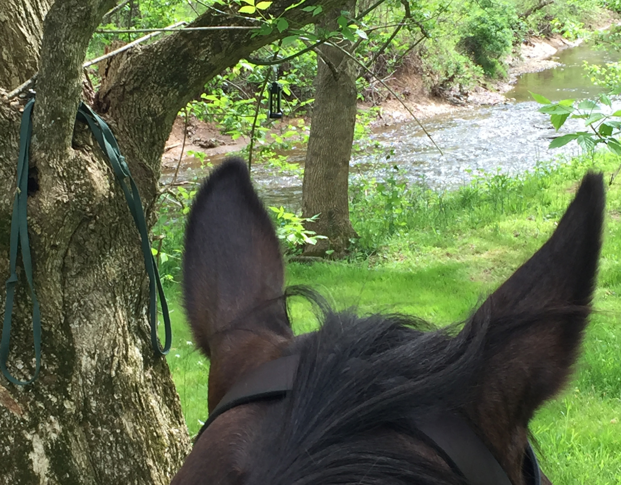 We finally caught a break after twenty-some straight days of rain this spring. The landscape woke up from a stark and bleak sleep in an explosion of green. Once again, we’re enjoying meandering paths that are lush, vibrant and alive. Here’s a photo of the view that inspired the House Key love scene in Chapter 41, “Wildcat Mountain”. Can you make out the object hanging above my horse’s left ear?