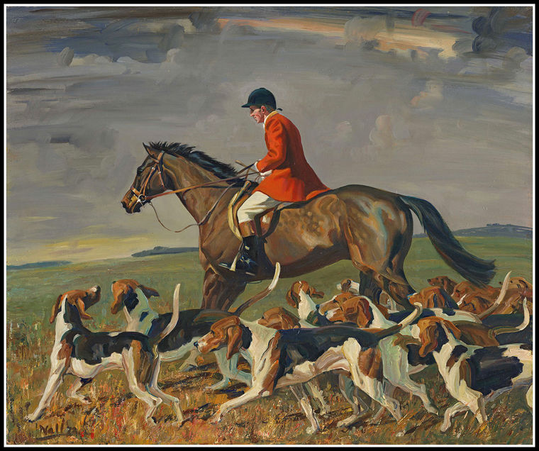 Nall was prolific and popular with the local hunt clubs, whose masters of fox hounds are often depicted with remarkable likeness, according to my friend and Whipper-in who had met many of them as a youngster. It was as much fun studying the paintings as it was observing her reactions as she exclaimed, “That’s So-and-so, and that’s just how I remember his expression!” Then she’d reminisce about their feats and their horses, many of whom she remembered, as well.